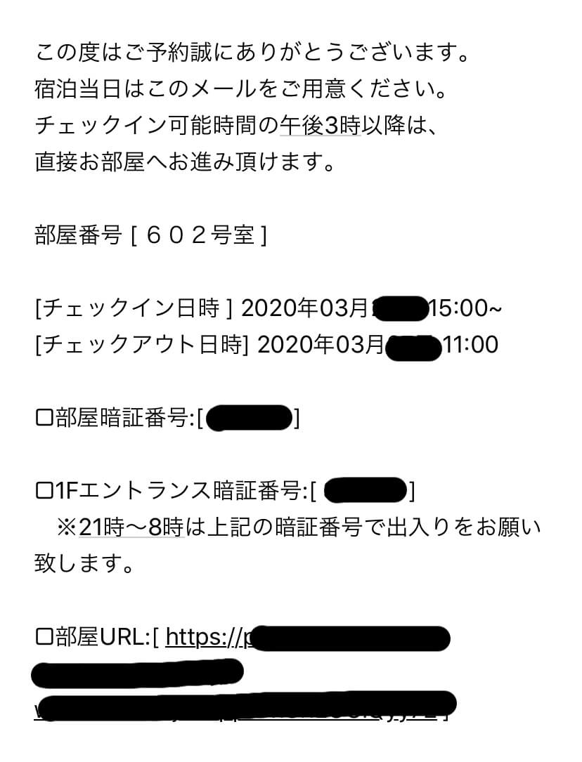 上の写真のようなメールが宿泊の前日に届き、お部屋番号・暗証番号・URLが知らされます。