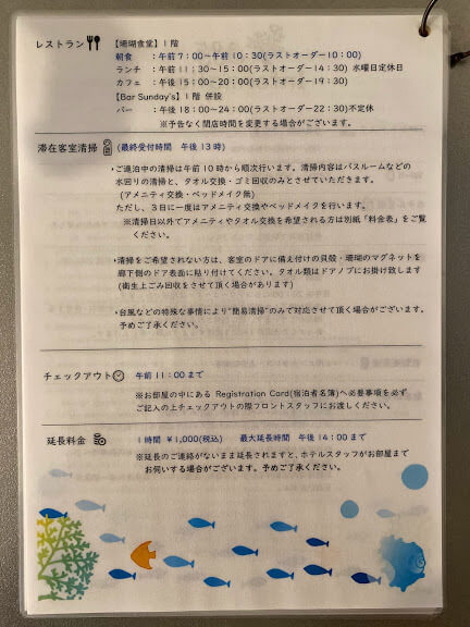 お部屋の中にホテルについてのインフォメーションが書かれた冊子があり、館内施設・客室清掃・貸し出し品など、チェックイン時にいつも聞いているような情報はここに全て書かれています。