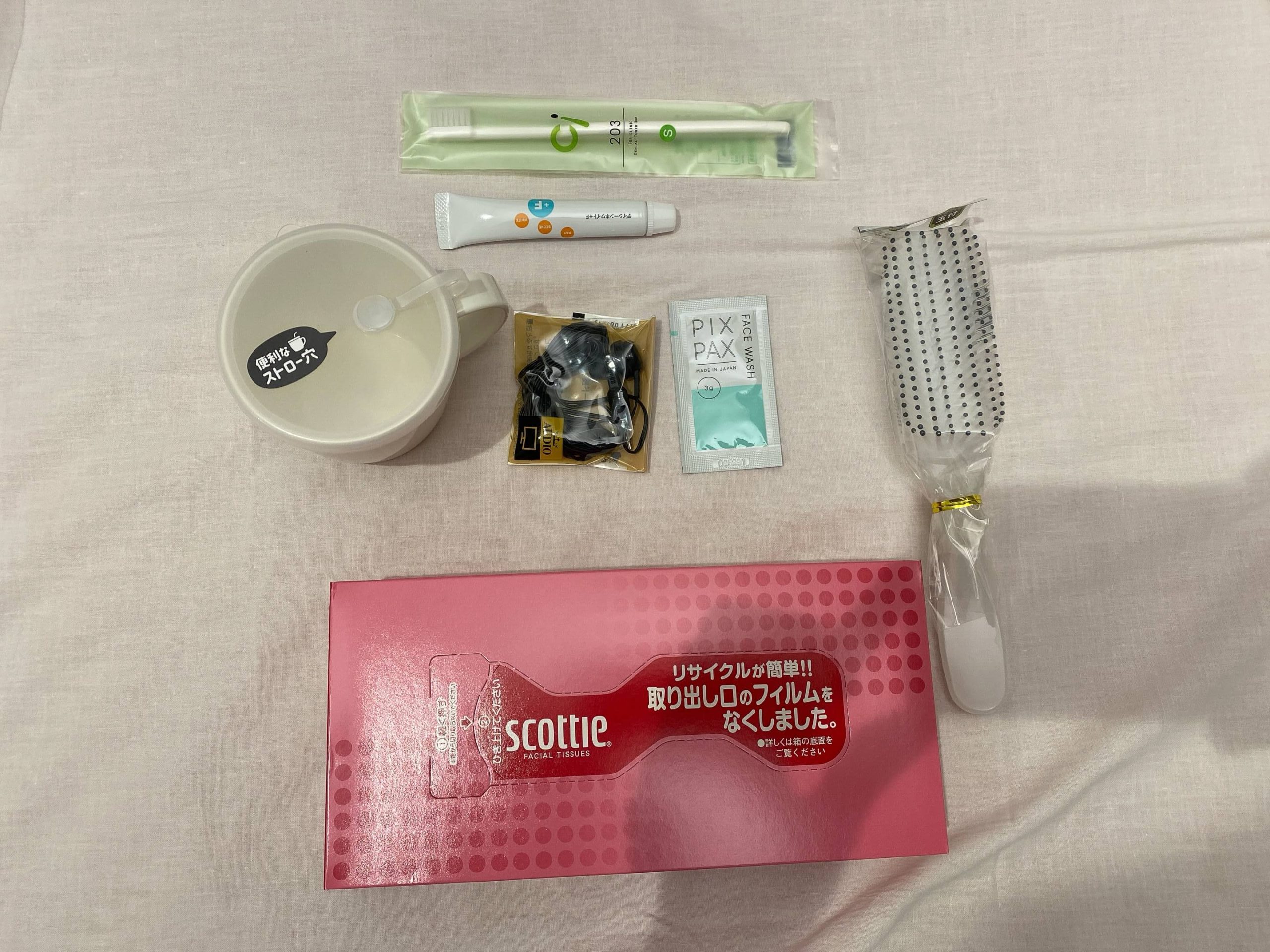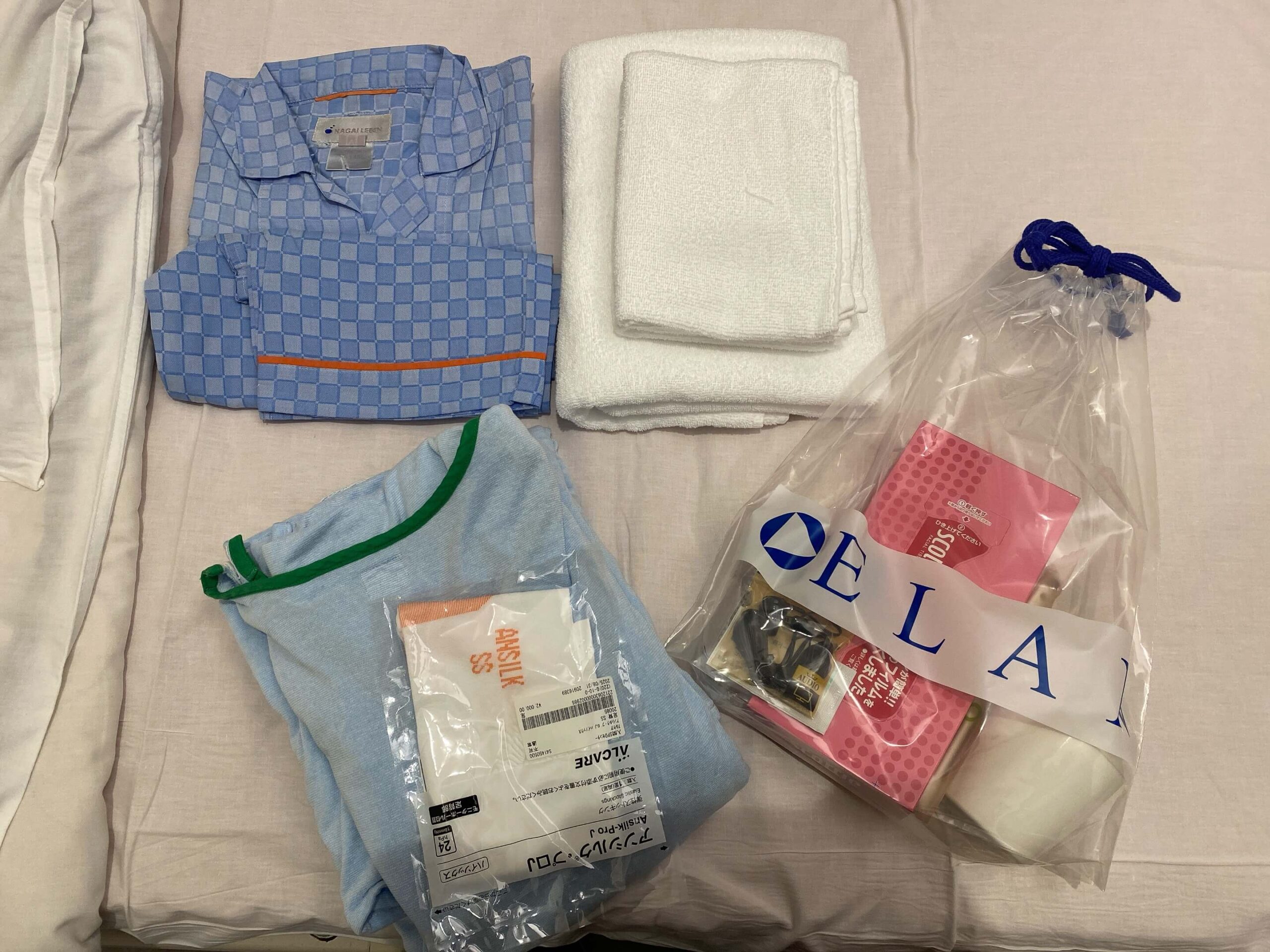 セットの中身は、パジャマ、タオル、入院着、着圧ソックス、歯ブラシ、歯磨き粉、コップ、イヤホン、洗顔フォーム、ヘアブラシ、箱ティッシュでした。