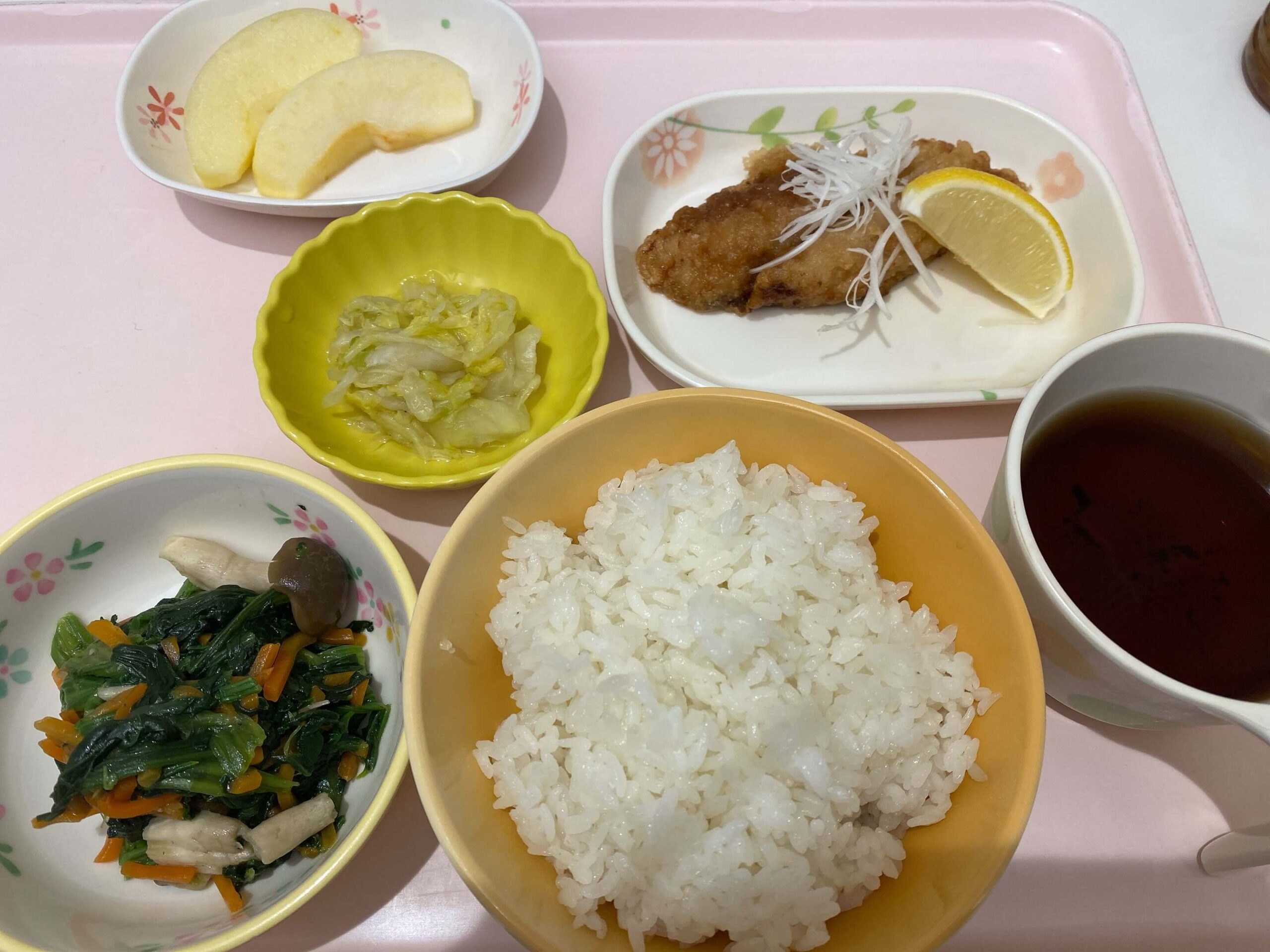 1日目の夕食は、ご飯、魚、ほうれん草のおひたし、キャベツの漬物、リンゴ2切れで、いたって普通の食事でした。