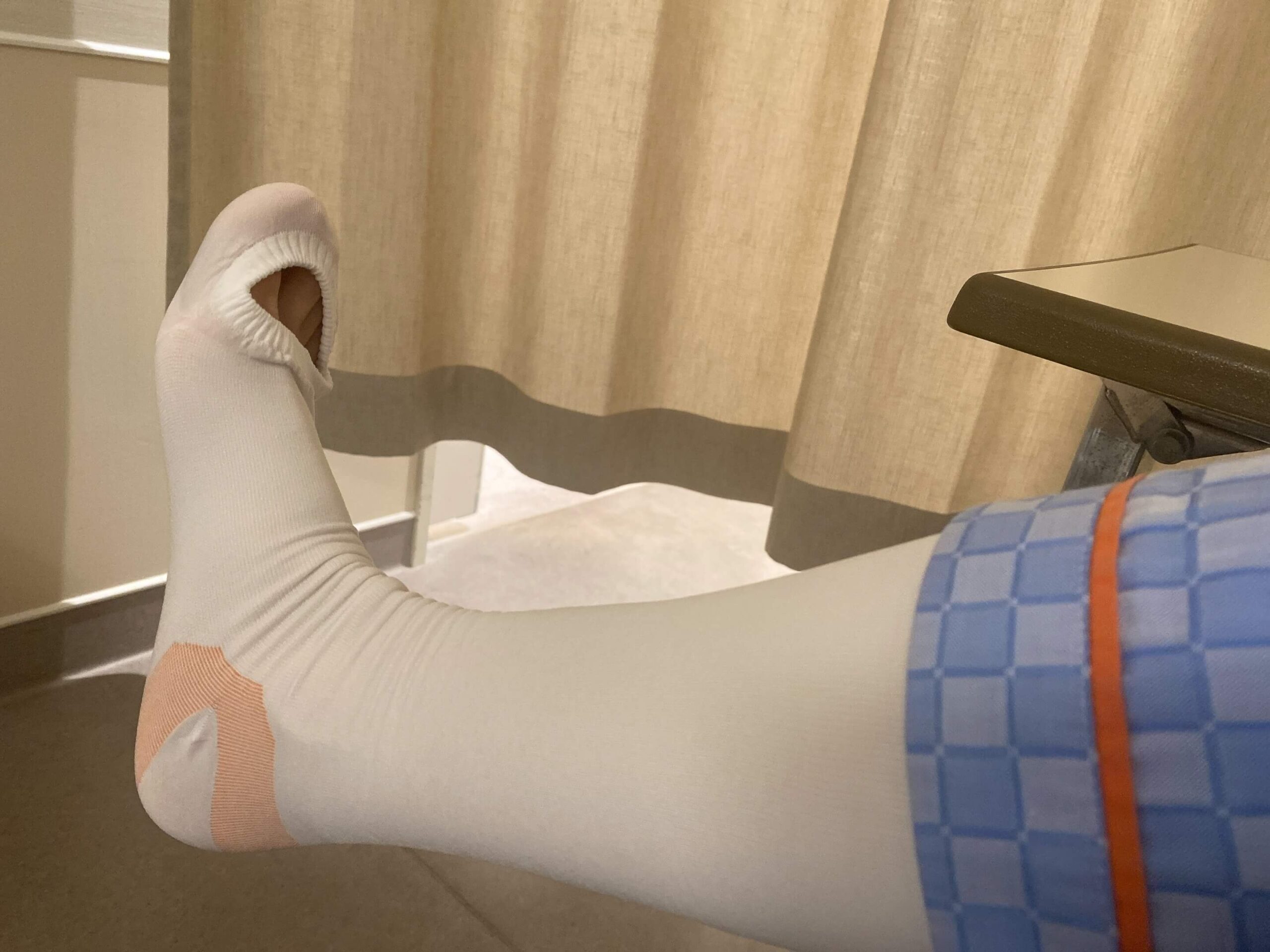 - 手術着と着圧ストッキングに着替え、点滴開始